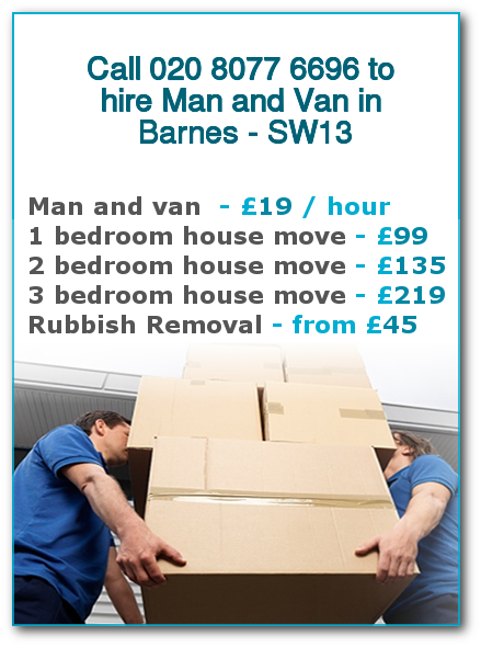 Check out what we have regarding furniture deliveries in the SW13 Barnes area. Our company is the leading name when it comes to all sorts of Barnes SW13 household man and van removals as we have a very capable team of movers and they can assist at all times you in any situation. Our experts are in charge of teaching new associates among our lines and this is really good for our team chemistry and levels of professionalism. Our deals may involve nationwide van with a man relocations and SW13 Barnes end of tenancy cleaning . Get us also for a complete home clearance where we can rid you of useless things .Get A Price Estimate